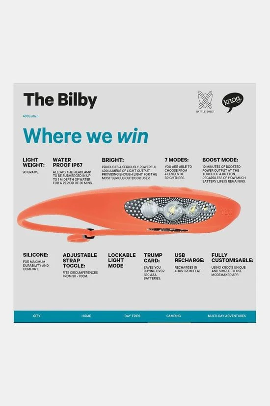 - Ook heeft Knog deze hoofdlamp uitgerust met een speciale boost-mode. Hiermee beschikt de hoofdlamp voor 10min over zijn maximale vermogen voor als je snel wat extra licht nodig hebt/