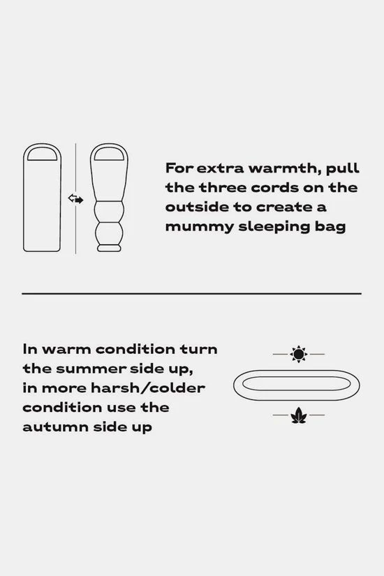 - Deze slaapzak verander je gemakkelijk van deken- naar mummyslaapzak met behulp van de koordjes aan de buitenkant en de slaapzak heeft een zomer én een herfstkant. Je hoeft ‘m dus alleen om te draaien om warmer of juist koeler te slapen.