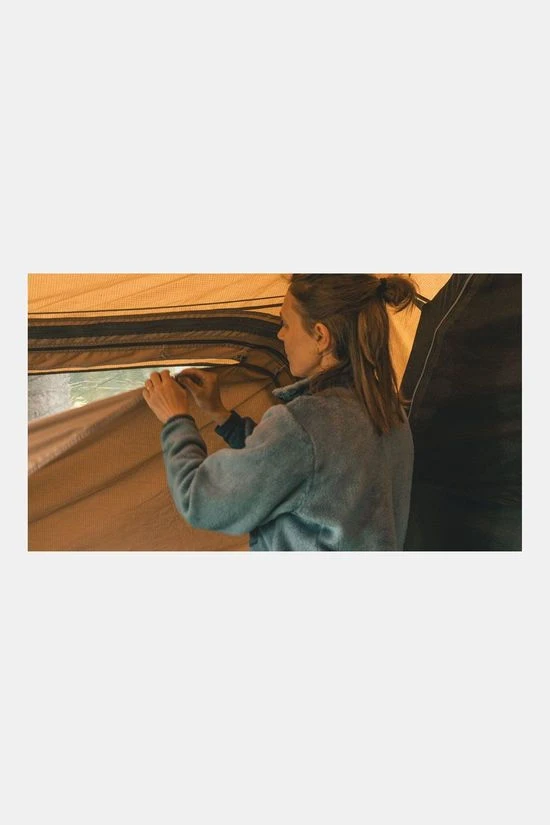 - Ventilatieopeningen achteraan en lage ventilatieopeningen helpen de luchtstroom te reguleren, wat wordt versterkt door gaaspanelen achter de externe deuren, die de tent openen voor insectenvrije ventilatie en een prachtig uitzicht.